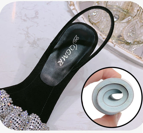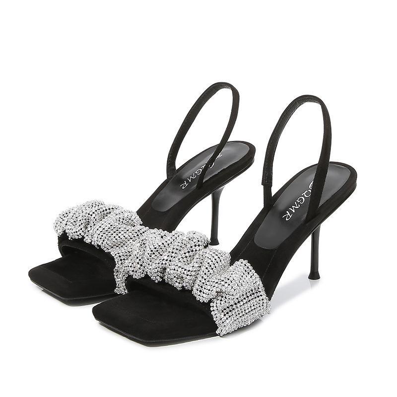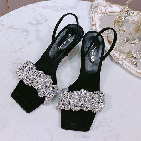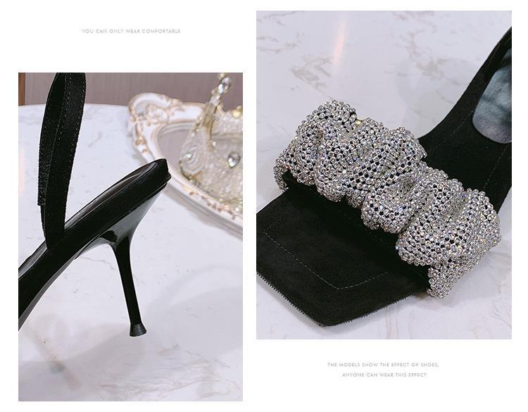 2021 One Word Strap High Heel Square Toe Sandals Women Rhinestone Sandals