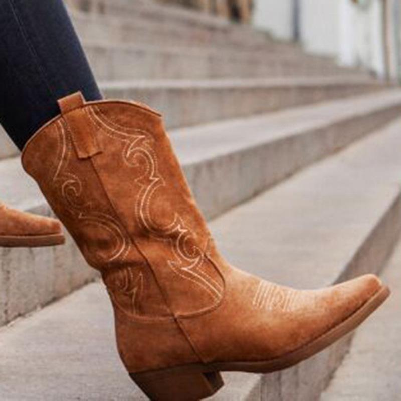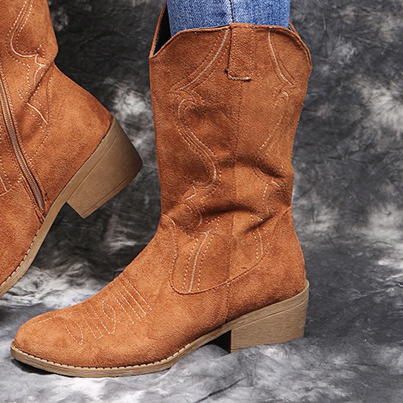 Embroidery Suede High Tube Low Heel Boots