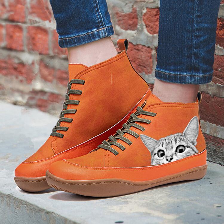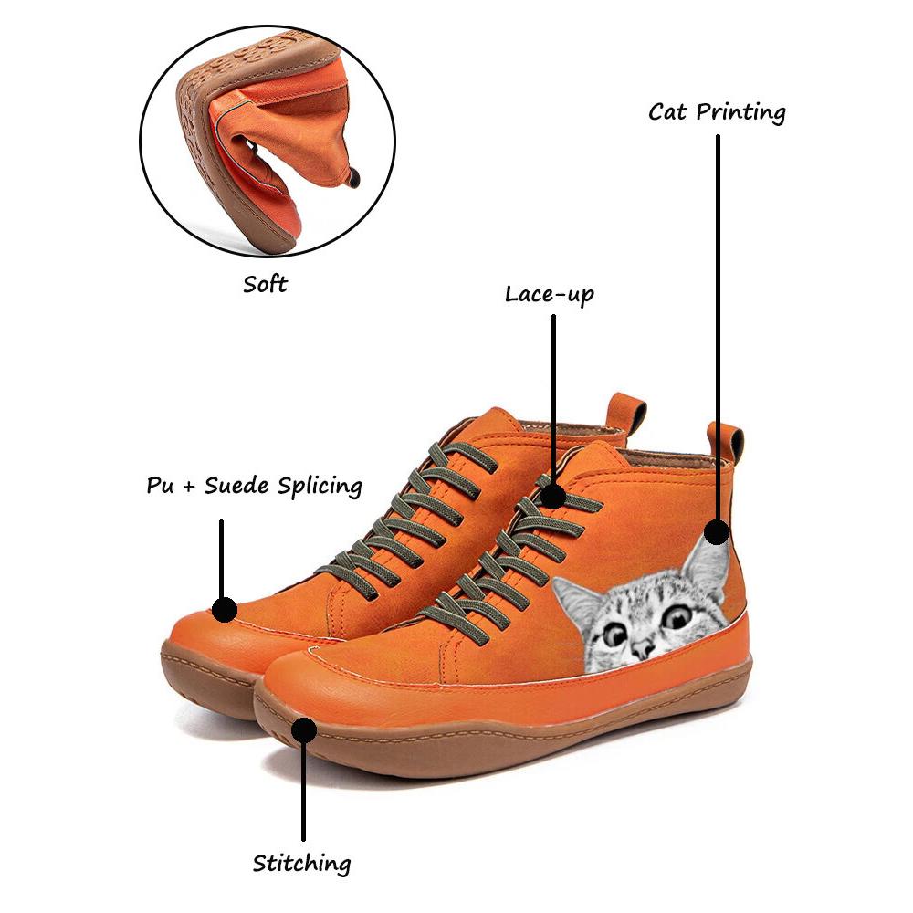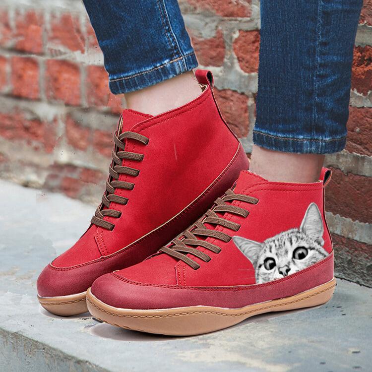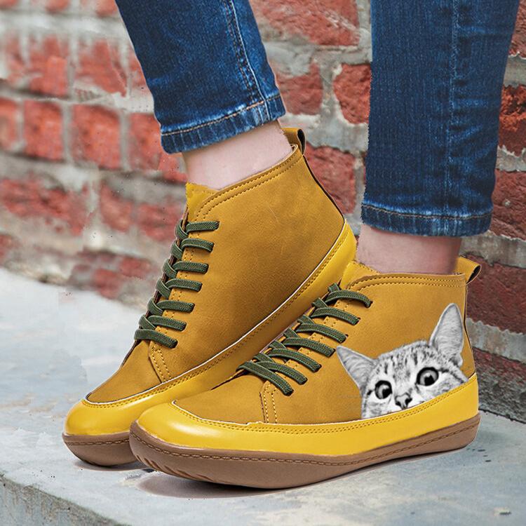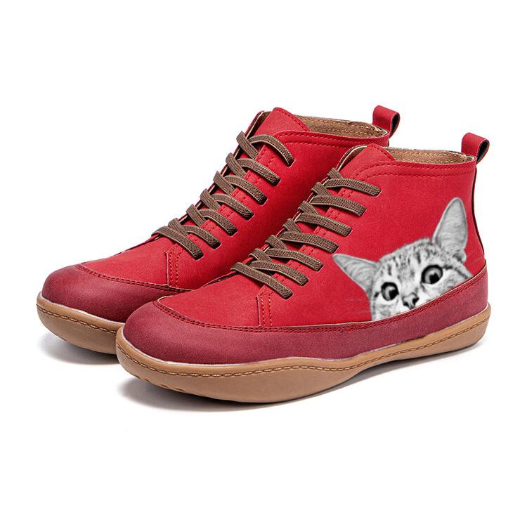 Lightweight Soft Cat Printing Lace Up Ankle Boots