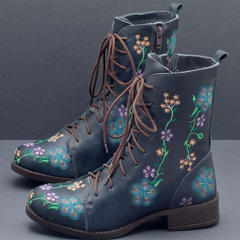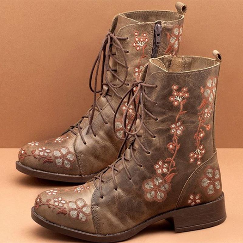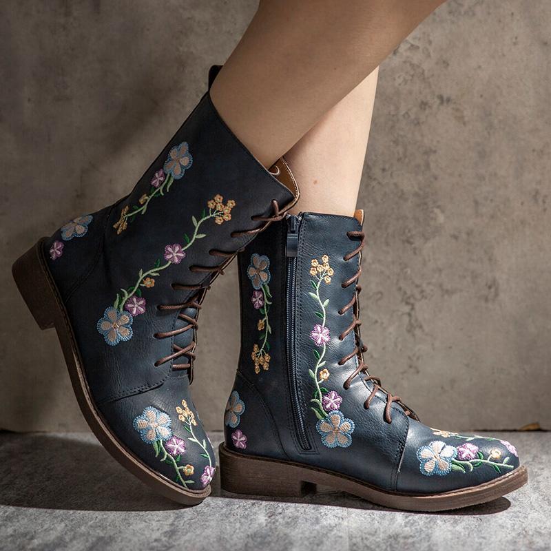 Retro Flowers Embroidered Leather Boots