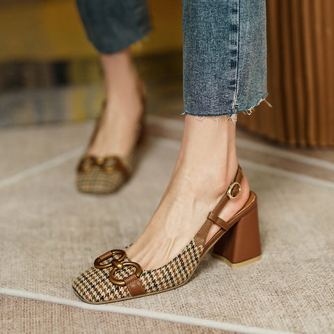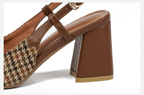 Retro Sandals Women Fashion Plaid Pattern Baotou Thick Heel